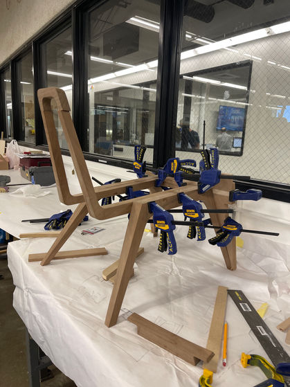 I initiated the process by fabricating a specialized jig designed for bending three layers of plywood into the intended shape. The jig itself was crafted by assembling precision-cut pieces of MDF. With, two layers of 1/8” plywood were aligned and bonded with slow-drying wood glue. The layers were then firmly secured in place, undergoing a 24-hour clamping period.